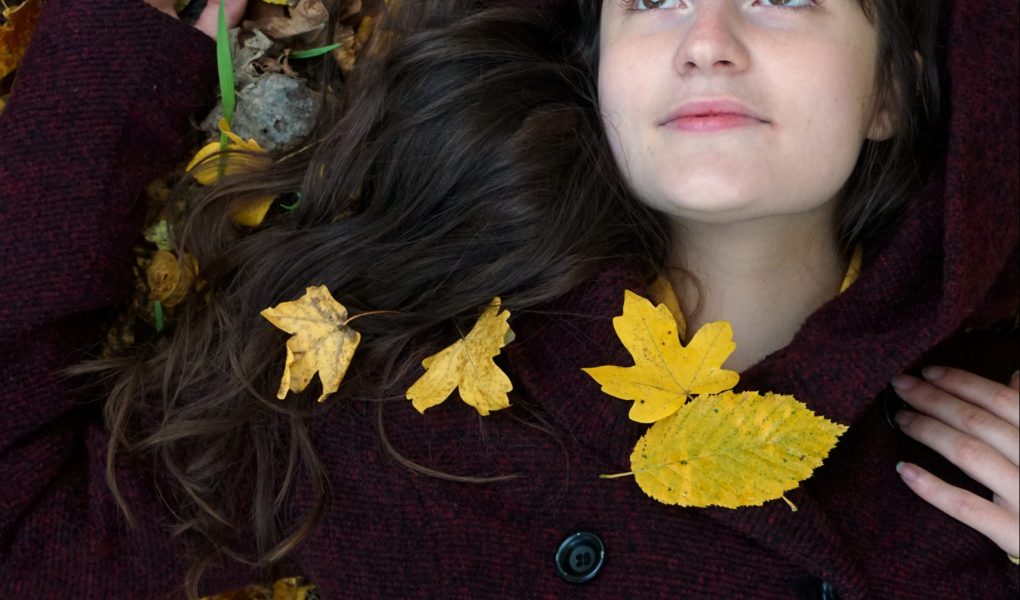 Girl laying in autumn leaves.
